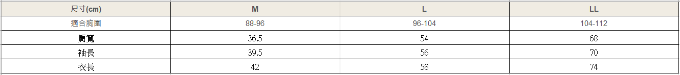 ※ 本尺寸表會因布料彈性、水洗處理、測量起訖點、人為拉扯等因素,與實際商品尺寸略有誤差。